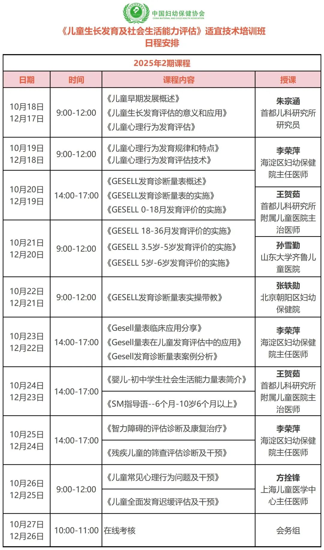 为深入贯彻落实国家关于儿童健康发展的政策要求,提高各级妇幼保健机构、医疗机构及相关单位儿童保健专业人员对儿童生长发育行为评估的能力,推动科学、规范的儿童发育评估工具在基层的广泛应用,赋能儿童早期发展服务能力建设,加强儿童健康管理,促进儿童综合发展和健康成长。中国妇幼保健协会妇幼健康培训基地定于2025年10月18日—12月26日在线上举办《儿童生长发育及社会生活能力评估》适宜技术培训班。