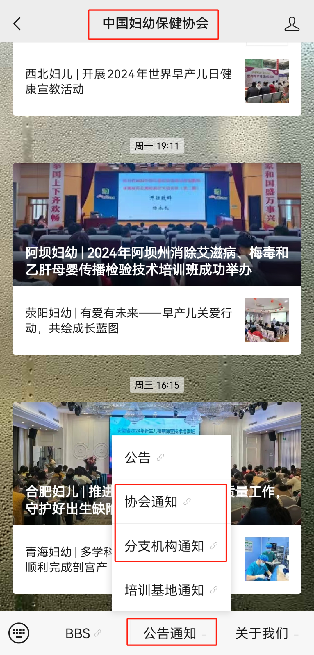 微信搜索公众号“中国妇幼保健协会”,关注后,底部菜单选择:公告通知--选择【协会通知】或【分支机构通知】进入选择)下载会议通知。