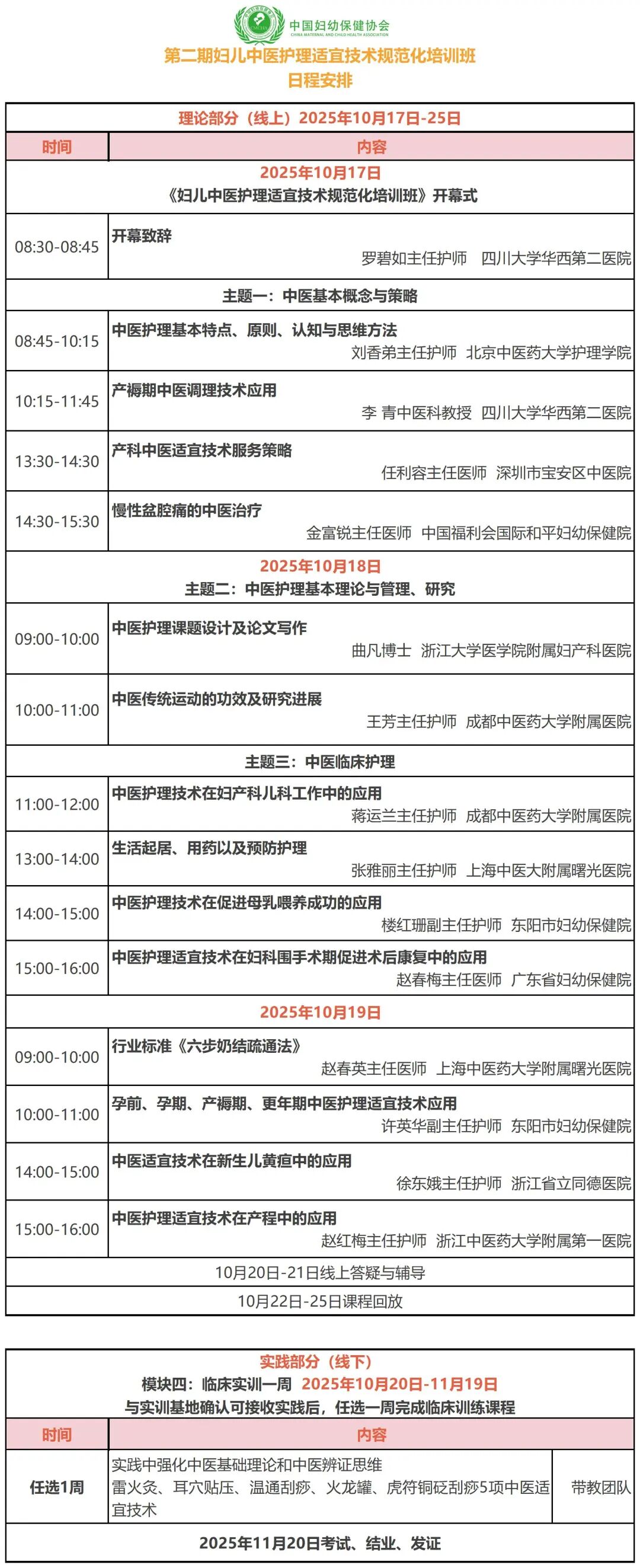 为严格落实《推进妇幼健康领域中医药工作实施方案(2021—2025年)》相关政策,完善制度、规范服务、示范引领,推动妇幼健康领域中医护理适宜技术工作有序开展,充分发挥中医药在妇幼健康领域内诊疗优势,不断提高妇女儿童健康水平,中国妇幼保健协会母婴健康培训基地定于2025年10月17日-11月20日举办“第二期妇儿中医护理适宜技术规范化培训班”。