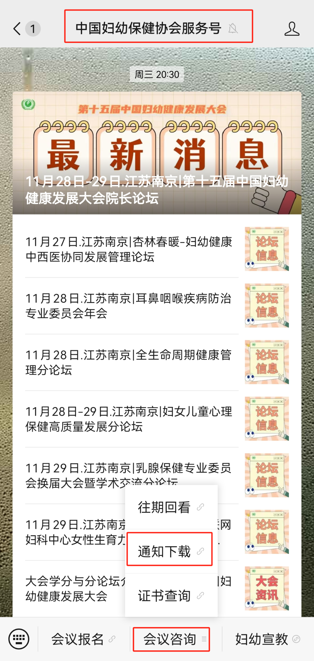 微信搜索公众号“中国妇幼保健协会服务号”,关注后,底部菜单选择:会议咨询--通知下载进入,往下翻找对应文件号或会议名下载通知。