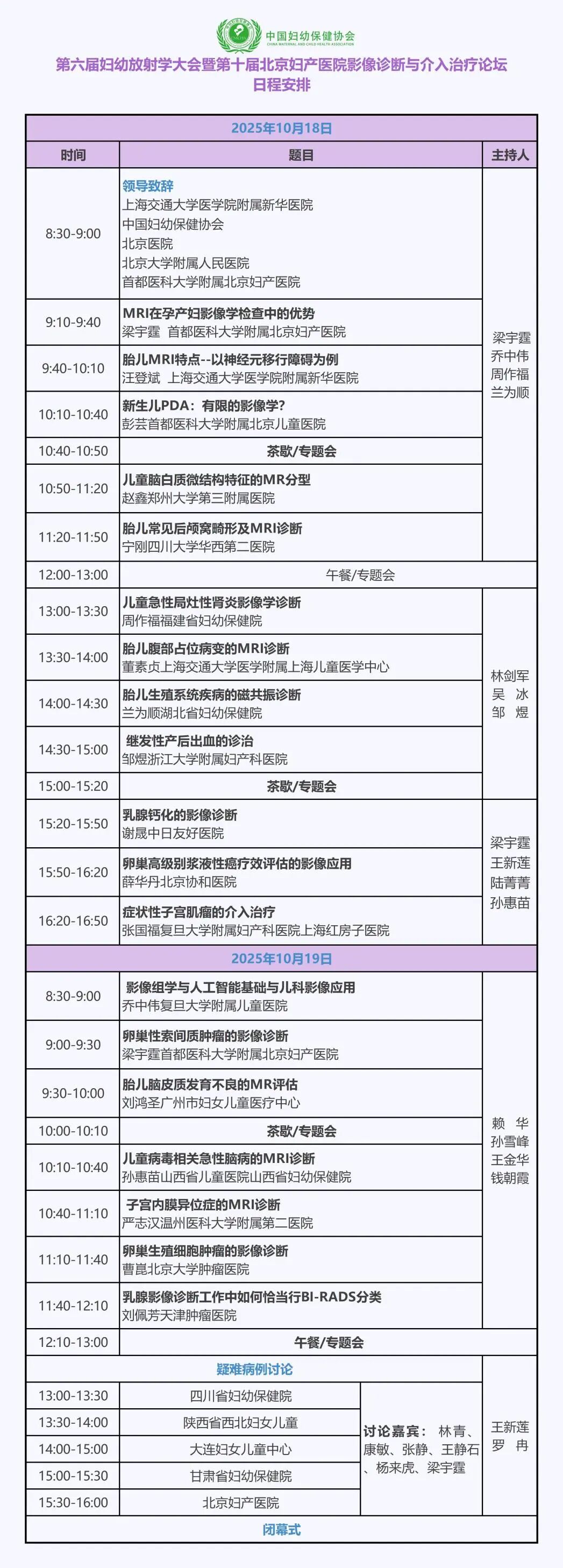 为推动妇幼影像学科发展和人才培养,推广影像规范化检查和诊断流程,提升影像检查的规范性和诊断准确性,促进影像互认和高质量影像数据,由中国妇幼保健协会主办、中国妇幼保健协会放射医学专业委员会承办、首都医科大学附属北京妇产医院协办的第六届妇幼放射学大会暨第十届北京妇产医院影像诊断与介入治疗论坛拟定于2025年10月18-19日在首都北京召开。