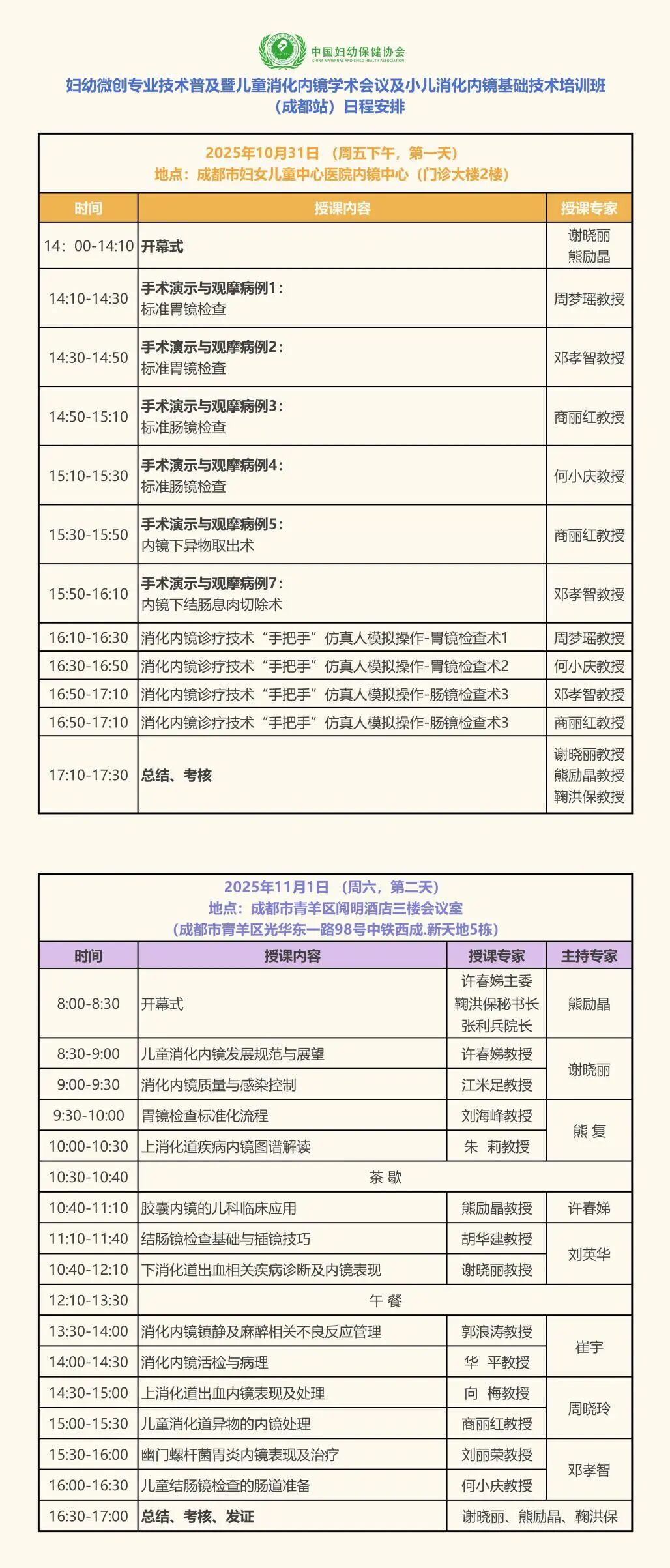 为规范儿童消化内镜操作技术,提高基层医师内镜诊疗水平,中国妇幼协保健协会妇幼微创专业委员会定于2025年10月31日-11月1日在四川成都举办“妇幼微创专业技术普及暨儿童消化内镜学术会议及小儿消化内镜基础技术培训班(成都站)”。