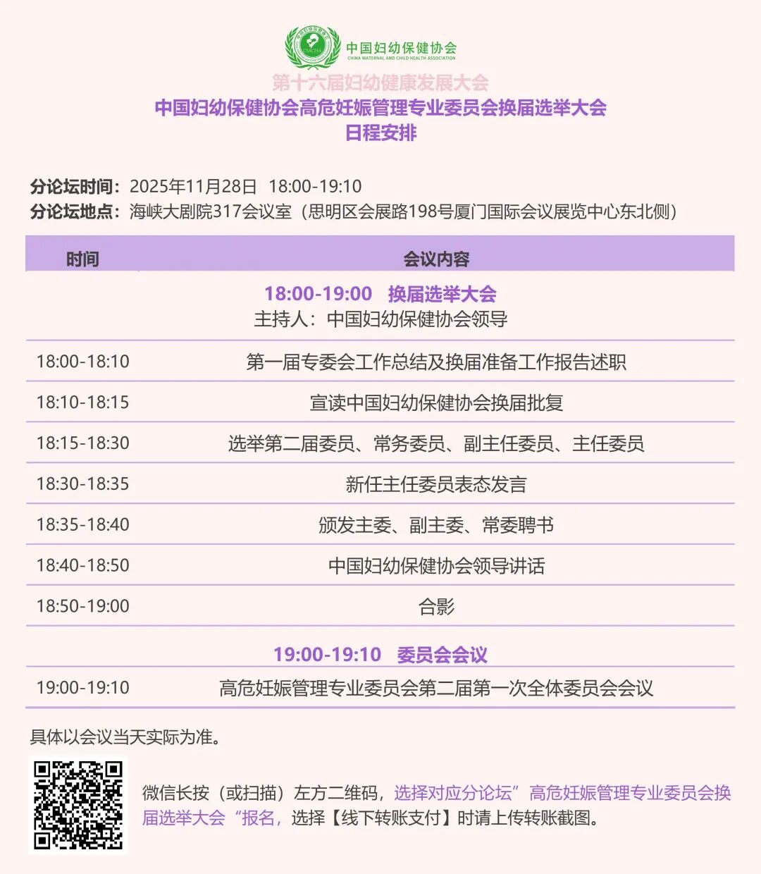 为进一步促进中国妇幼健康事业的高质量发展,更好地鼓舞全国各级妇幼保健医疗机构和妇幼健康工作者踔厉奋发、勇毅前行,展示全国妇幼健康工作的改革创新成果,中国妇幼保健协会定于2025年11月27日—30日在福建省厦门市召开《第十六届妇幼健康发展大会》,高危妊娠管理专业委员会将在此大会上召开“高危妊娠管理专业委员会换届选举大会”。