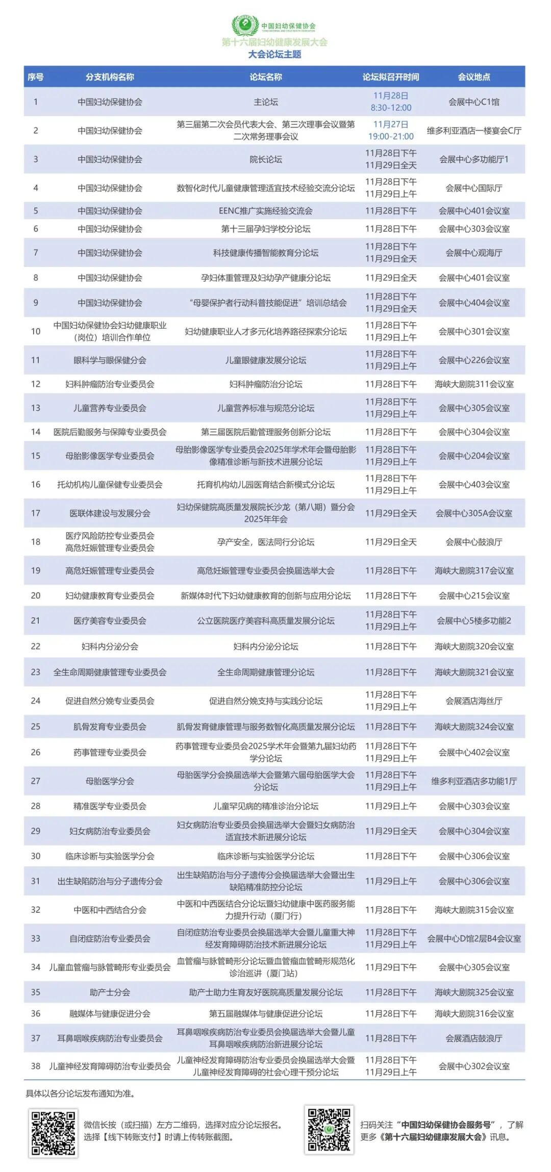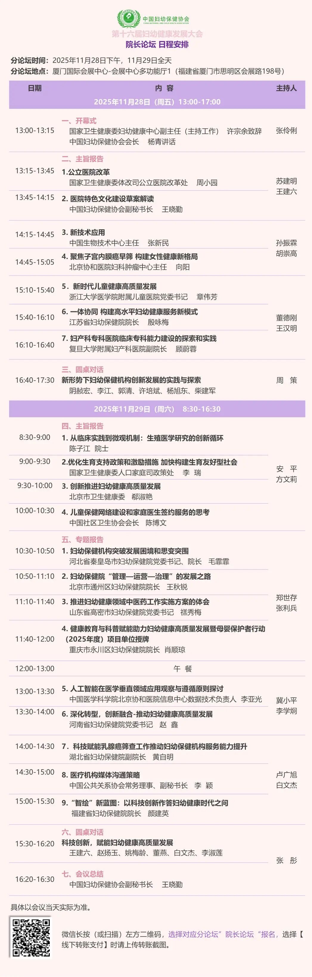 在全国上下深入学习党的二十大和二十届二中、三中全会精神之际,为全面贯彻落实“一法两纲”和健康中国战略,着力提高人口整体素质,进一步促进中国妇幼健康事业的高质量发展,更好地鼓舞全国各级妇幼保健医疗机构和妇幼健康工作者踔厉奋发、勇毅前行,展示全国妇幼健康工作的改革创新成果,中国妇幼保健协会定于2025年11月27日-30日在福建省厦门市召开“第十六届妇幼健康发展大会”,在此大会上将于11月28日-29日举办院长论坛。