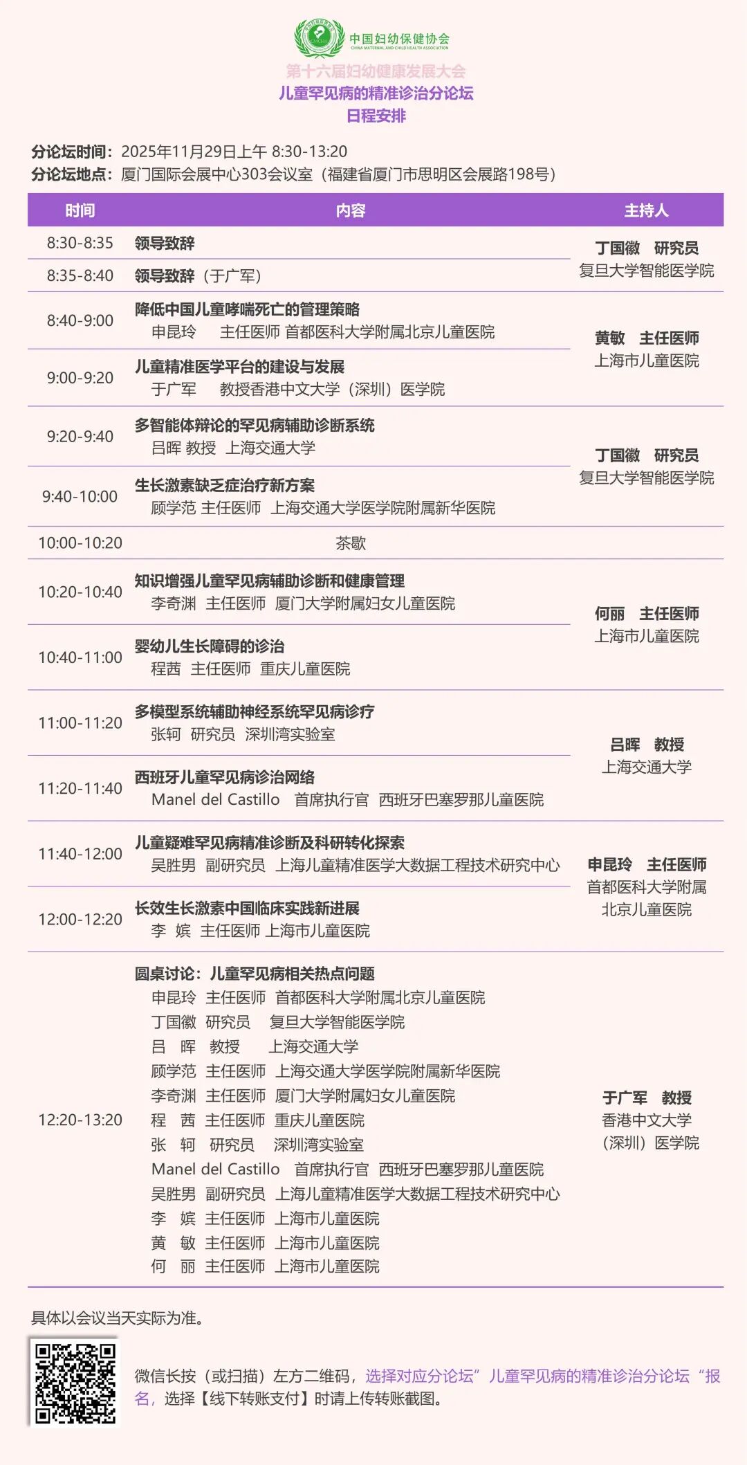 为进一步促进中国妇幼健康事业的高质量发展,更好地鼓舞全国各级妇幼保健医疗机构和妇幼健康工作者踔厉奋发、勇毅前行,展示全国妇幼健康工作的改革创新成果,中国妇幼保健协会定于2025年11月27日—30日在福建省厦门市召开《第十六届妇幼健康发展大会》,精准医学专业委员会将在此大会上召开“儿童罕见病的精准诊治分论坛”。