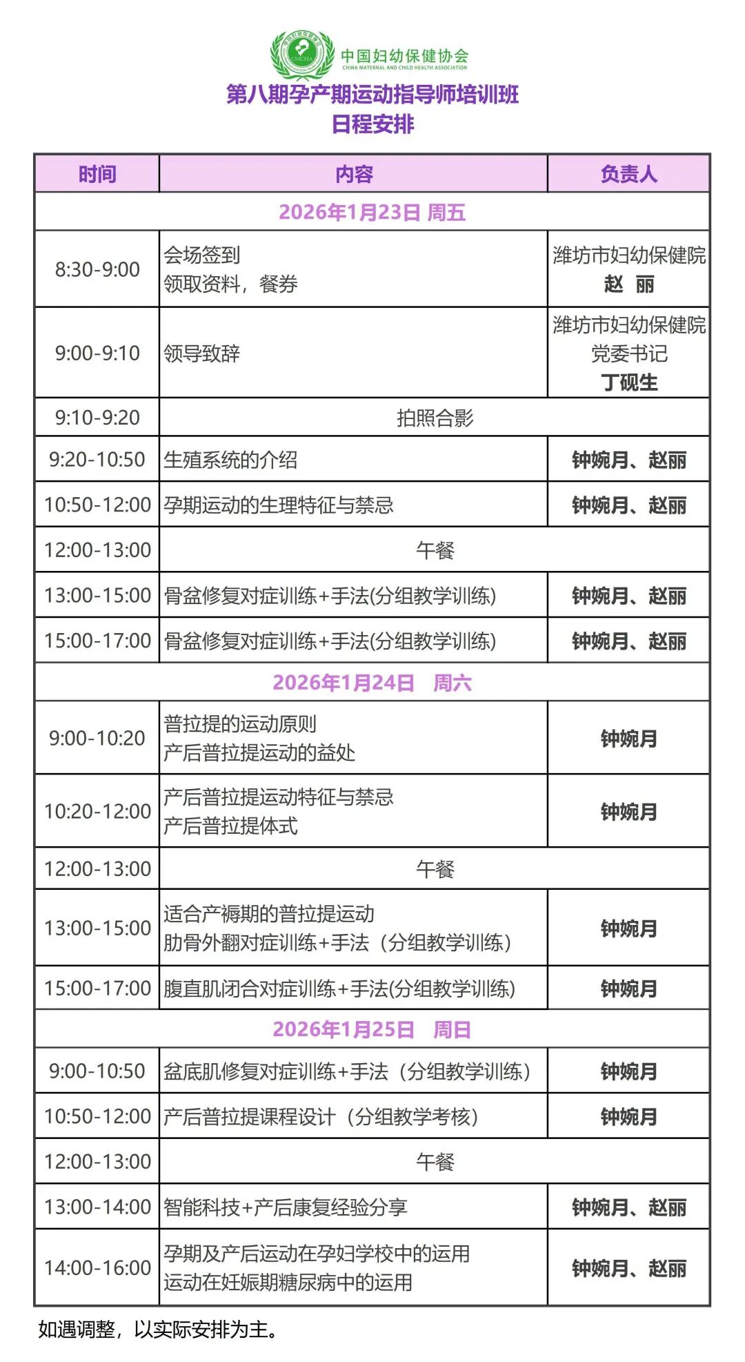 党的十九大明确提出推进健康中国建设,全面实施《“健康中国2030”规划纲要》适应新时期健康教育与健康促进工作发展的需要。落实健康中国行动,为给女性在孕产期这个特殊时期提供科学有效的孕产期运动及康复指导,规范专业孕产教师正确的指导技能技巧,提高全国孕产期运动指导者的专业人员业务素质、理论水平和服务能力,普及孕产期(普拉提)运动的基本知识与技能,推进全国妇幼保健及助产机构孕产期运动的宣教与教育工作。中国妇幼保健协会定于2026年1月23-25日在山东省潍坊市举办“第八期孕产运动指导师培训班”。