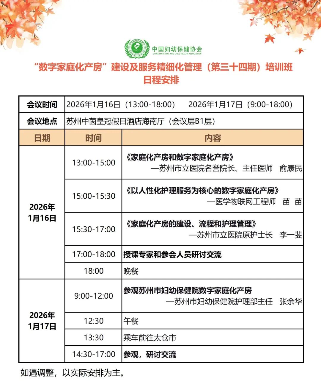 2026年1月16日-17日.江苏苏州 | “数字家庭化产房”建设及服务管理精细化管理(第三十四期)培训班