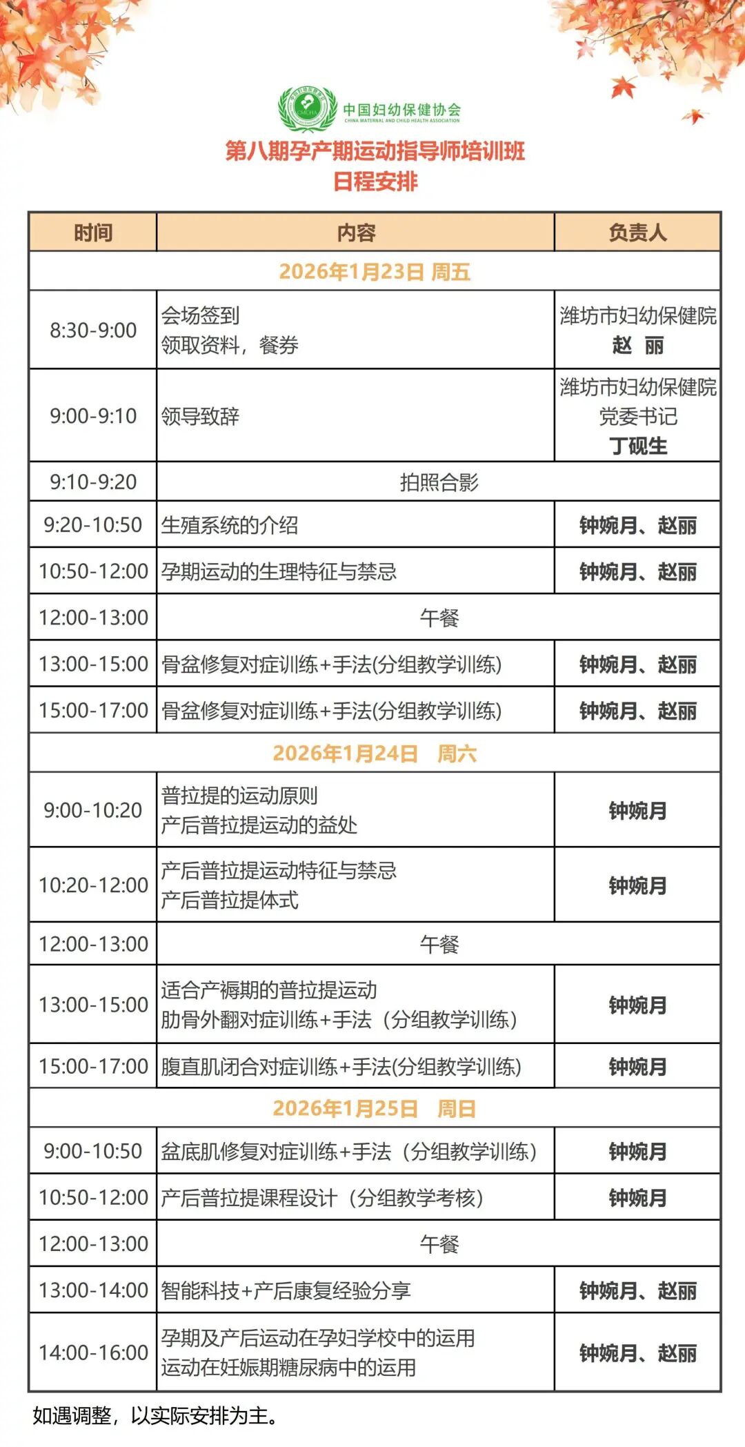 党的十九大明确提出推进健康中国建设,全面实施《“健康中国2030”规划纲要》适应新时期健康教育与健康促进工作发展的需要。落实健康中国行动,为给女性在孕产期这个特殊时期提供科学有效的孕产期运动及康复指导,规范专业孕产教师正确的指导技能技巧,提高全国孕产期运动指导者的专业人员业务素质、理论水平和服务能力,普及孕产期(普拉提)运动的基本知识与技能,推进全国妇幼保健及助产机构孕产期运动的宣教与教育工作。中国妇幼保健协会定于2026年1月23-25日在山东省潍坊市举办“第八期孕产运动指导师培训班”。