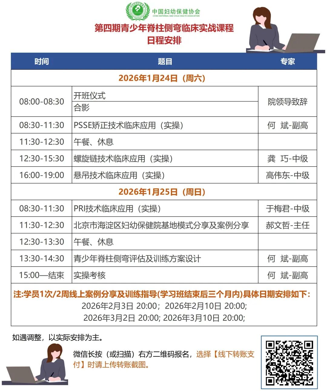 中国妇幼保健协会旨在推动青少年脊柱侧弯早期预防及早期干预,减少脊柱侧弯重症发生,避免重症术后引发更多障碍发生。发挥妇幼保健系统优势,运用运动方案及早改善探颈驼背平足问题,运用PSSE(脊柱侧弯特定运动疗法)针对性解决轻、中度脊柱侧弯障碍问题,结合康复工程学及康复辅助技术早期干预脊柱侧弯发展,提升青少年运动能力,保障青少年身心健康。中国妇幼保健协会肌骨发育专业委员会定于2026年1月24日-25日在北京举办青少年脊柱侧弯临床实战课程。