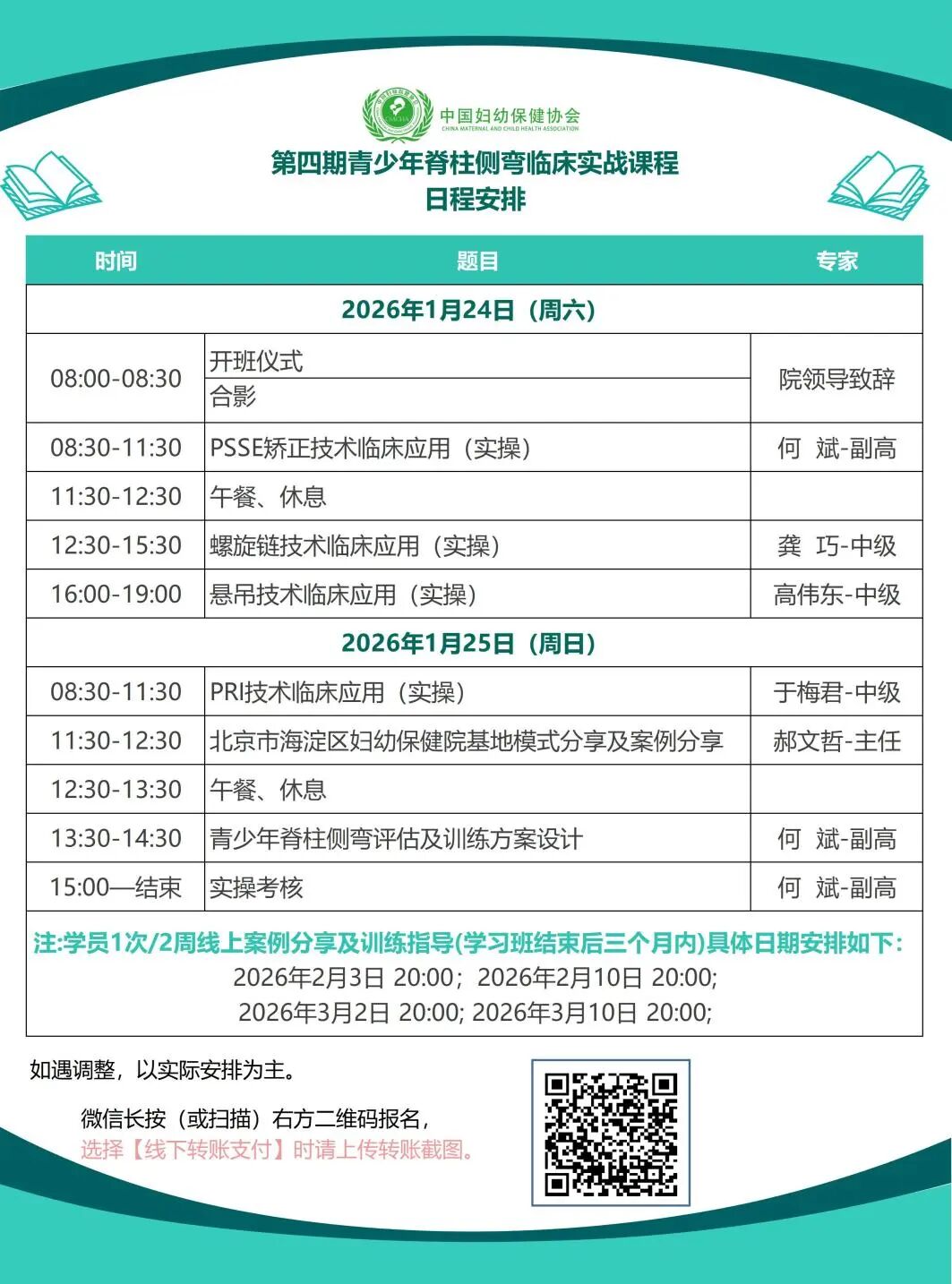 中国妇幼保健协会旨在推动青少年脊柱侧弯早期预防及早期干预,减少脊柱侧弯重症发生,避免重症术后引发更多障碍发生。发挥妇幼保健系统优势,运用运动方案及早改善探颈驼背平足问题,运用PSSE(脊柱侧弯特定运动疗法)针对性解决轻、中度脊柱侧弯障碍问题,结合康复工程学及康复辅助技术早期干预脊柱侧弯发展,提升青少年运动能力,保障青少年身心健康。中国妇幼保健协会肌骨发育专业委员会定于2026年1月24日-25日在北京举办青少年脊柱侧弯临床实战课程。