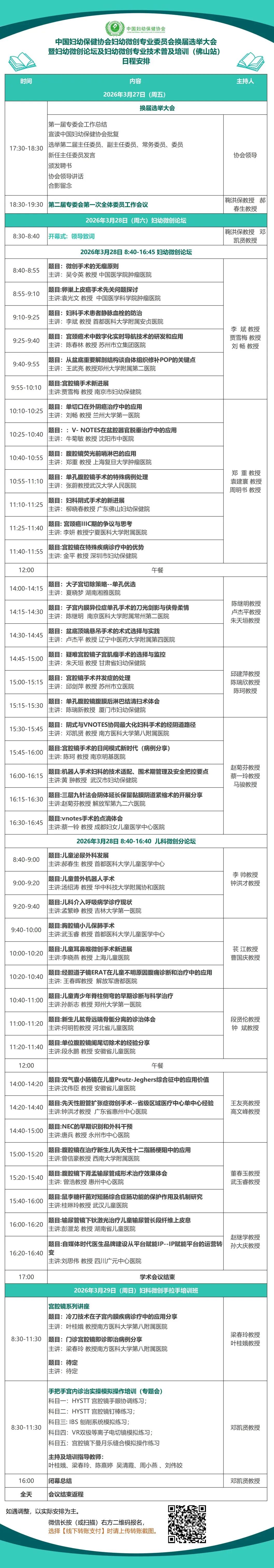 为推进妇幼微创临床手术规范化发展,助力妇幼微创临床医疗体系建设,进一步提升妇产科学医疗服务能力,根据2026年分支机构学术计划,中国妇幼保健协会妇幼微创专业委员会定于2026年3月27日-29日在广东省佛山市举办“换届选举大会暨妇幼微创论坛及妇幼微创专业技术普及培训(佛山站)”,会议将邀请国内相关领域的专家进行讲座和手把手模拟教学演示,培训结束颁发中国妇幼保健协会培训结业证书,请各相关单位积极组织参加。