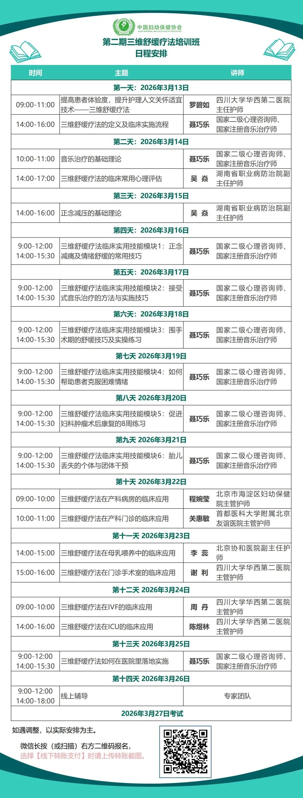 学员须在规定时间内完成全部课程学习及考核,成绩合格者由中国妇幼保健协会颁发《三维舒缓疗法》培训证书。