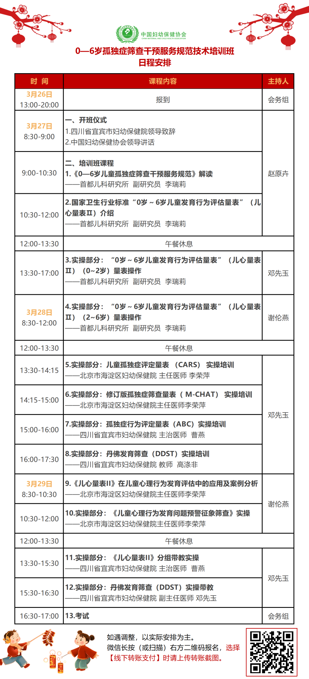 为贯彻落实《“健康中国2030”规划纲要》、《中国儿童发展纲要(2021-2030年)》精神,根据《国家基本公共卫生服务规范》和《国家卫生健康委办公厅关于印发0—6岁儿童孤独症筛查干预服务规范(试行)的通知》要求,进一步提升基层儿童保健服务机构在0—6岁儿童孤独症筛查、早期识别与干预方面的专业能力,应规范中“服务机构和人员技术要求中至少1名接受过儿童心理行为发育筛查技术培训并合格、从事儿童保健服务的医务人员。”的要求,中国妇幼保健协会定于2026年3月26日-29日在宜宾市举办“0—6岁”孤独症筛查干预服务规范技术培训班,本次培训聚焦基层医师实际工作需求,授课专家结合丰富临床实践经验,采用理论讲解、案例分析、实操训练、现场答疑等多元化形式,掌握儿童孤独症评定量表(CARS)、孤独症行为评定量表(ABC)、孤独症筛查量表(M-CHAT)、丹佛发育筛查(DDST)测评技术等孤独症早期筛查的核心技术与工作方法。