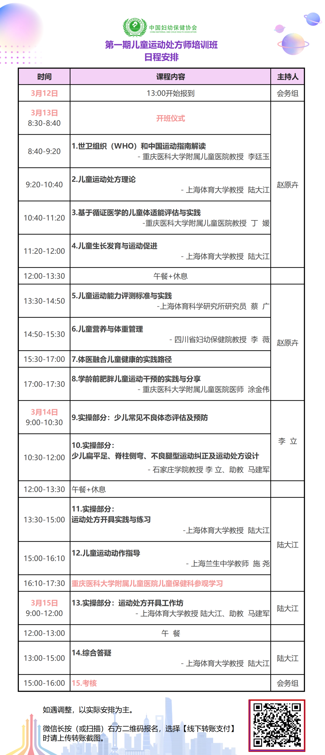 为全面助力健康中国战略和贯彻落实国家卫健委《健康儿童行动计划(2021-2025)》《“健康中国2030”规划纲要》,加强体医融合和非医疗健康干预,建立和完善针对不同人群、不同环境、不同身体状况的运动处方库,推动形成体医结合的疾病管理与健康服务模式,发挥儿童科学运动在健康促进、慢性病预防和康复等方面的积极作用,纠正近年来儿童出现视力、肥胖、姿势性驼背、脊柱侧弯、动作协调性等方面的问题,通过科学的体育锻炼帮助儿童健康生长,达到力量、协调、柔韧等能力全面发展。中国妇幼保健协会定于2026年3月13日-15日在重庆举办2026年第一期“儿童运动处方师培训班”。