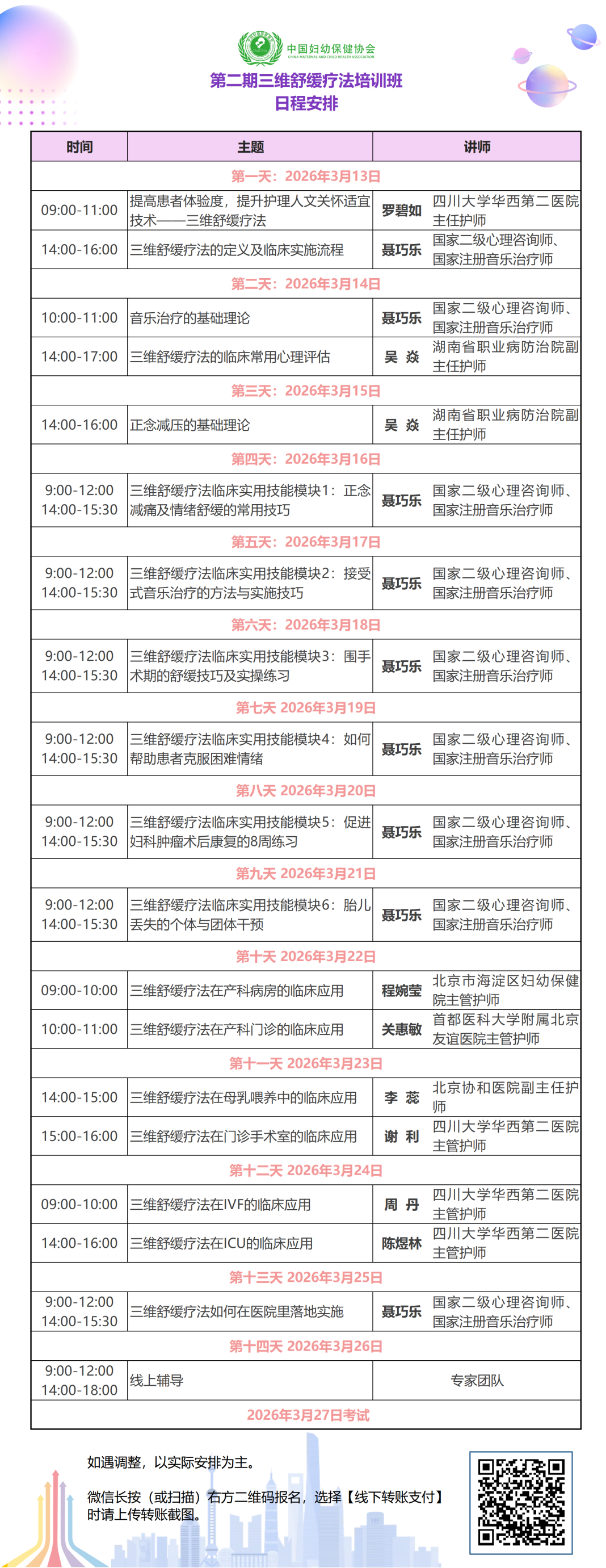 随着社会的进步与发展,提升护理人文与医疗人文的需求与日俱增。为了适应新形势下的医护人文关怀的内容、技术、模式变革的需求,为患者提供全方位的身心支持,进一步完善和推进患者的舒适就医体验,使其享受舒适的就医氛围,获得舒缓的就医体验。中国妇幼保健协会定于2026年3月13日—27日线上举办第二期“三维舒缓疗法培训班”,为医护工作者培训相关人文医疗的治疗理念和实施方法。