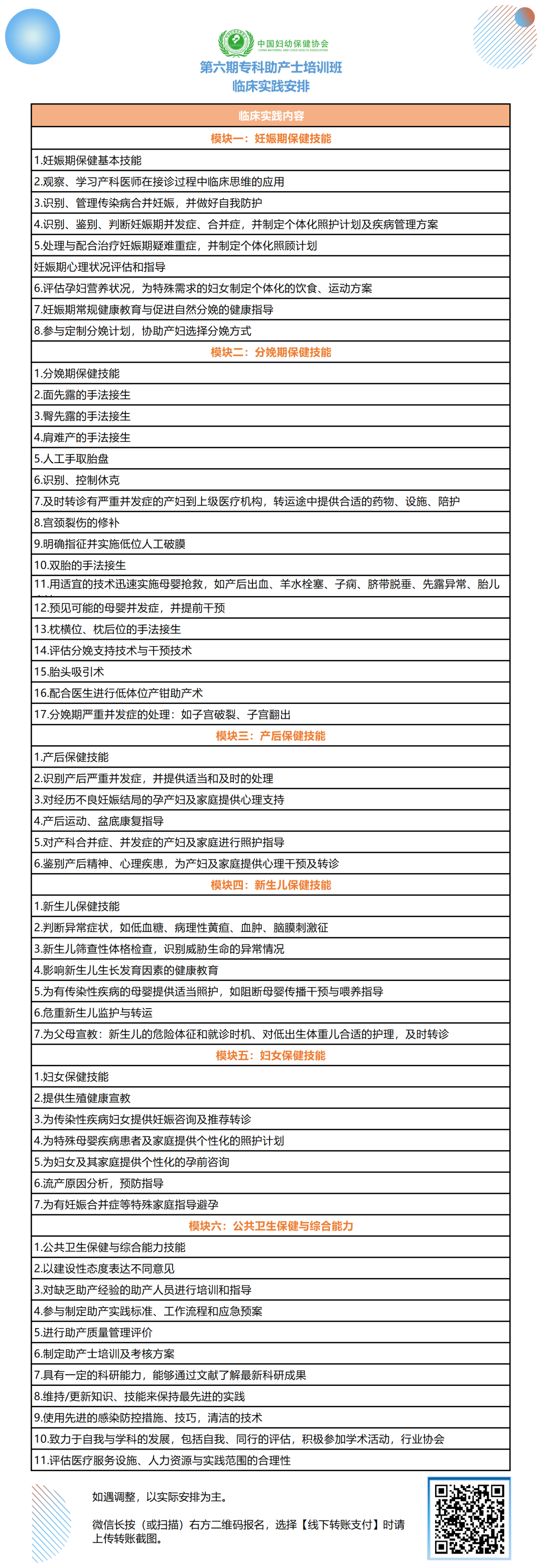 为了响应国家《关于加快完善生育支持政策体系推动建设生育友好型社会的若干措施》(国办发〔2024〕48号)及《关于推进生育友好医院建设的意见》(国卫办妇幼发〔2024〕31号)号召,推动生育友好型医院建设,实现健康中国2030目标,切实提高助产士的专业技术水平和临床实践能力,中国妇幼保健协会继续秉承“赋能助产士,助力母婴健康事业发展”的宗旨,持续推进“专科助产士”培训工作,进一步提升助产士的专业能力和服务水平,协会定于2026年5月26日-6月25日开展第六期专科助产士培训班临床实践。各省市曾在专科助产士培训项目中承担临床培训任务,并有意持续支持专科助产士成长的单位,按规定内容完成临床实践培训及考核。