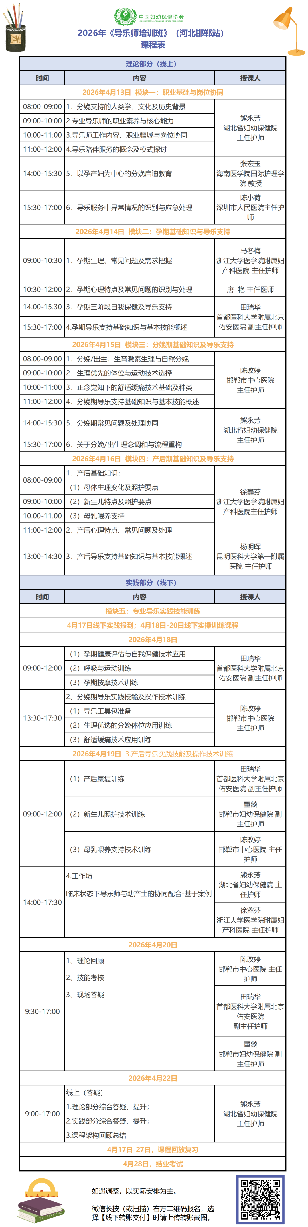 为了适应新生育形式下产科服务内容、技术、模式变革的需求,进一步完善和推进导乐陪伴服务,为孕产妇提供切合需求的身心全方位支持,使其获得“积极的分娩体验”。中国妇幼保健协会(以下简称“协会”)继续秉承赋能助产士,助力导乐陪伴服务为目标,在总结经验的基础上,对导乐培训进行了梳理和更新,引入助产士对导乐的专业支持,助力导乐师全程、持续、全方位、个性化服务于妊娠分娩中的妇女、胎婴儿及其家庭,切实解决妇女孕期、分娩和产后的照护中的实际问题,2026年继续组织培训,促进导乐陪伴分娩服务工作的开展。协会定于2026年4月13日-28日通过线上线下相结合方式在河北邯郸举办导乐师培训班。